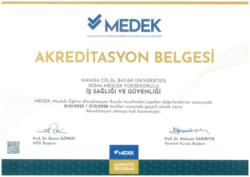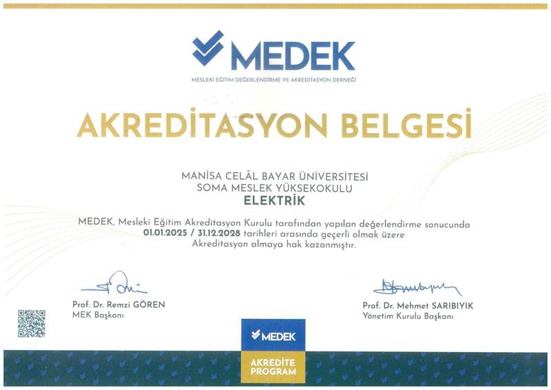 Meslek Yüksekokulumuz; Elektrik, Makine, Mekatronik, İş Sağlığı ve Güvenliği programları ile Mesleki Eğitim Değerlendirme ve Akreditasyon Derneği (MEDEK) tarafından yapılan değerlendirmeler sonucunda 01.01.2025 - 31.12.2028 tarihleri arasında 4 (dört) yıllık tam akreditasyon almaya hak kazanmıştır. Akredite programımızdan mezun olan öğrencilerimizin diplomaları, Türkiye Yeterlilikler Çerçevesi (TYÇ) ve Avrupa Yeterlilikler Çerçevesi (AYÇ) ile tam uyumlu hale getirilerek uluslararası tanınırlık kazanacaktır. Bu sayede mezunlarımız, yurt içinde ve yurt dışında daha geniş iş olanaklarına sahip olacak, işletmeler ise aradıkları nitelikli işgücüne kolayca ulaşabilecektir.